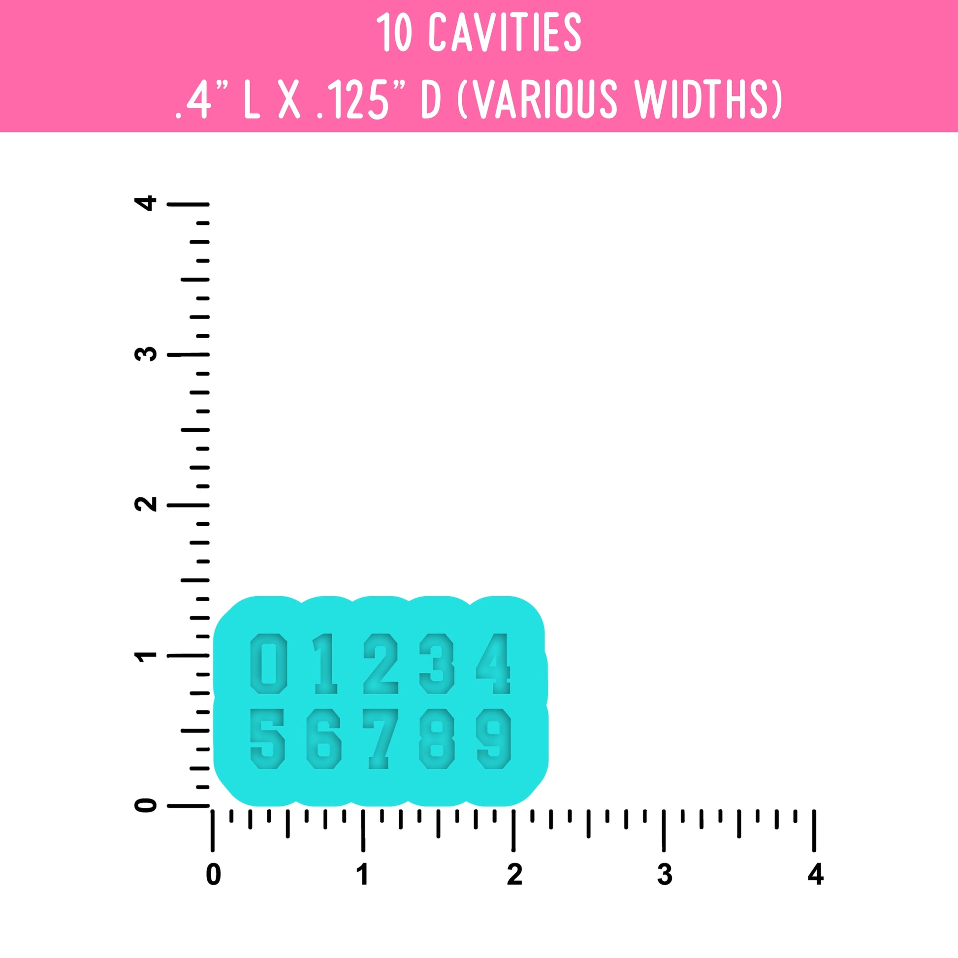 Custom order for a sports numbers resin silicone mold including 10 cavities measuring .4" long by .125" deep with various widths.